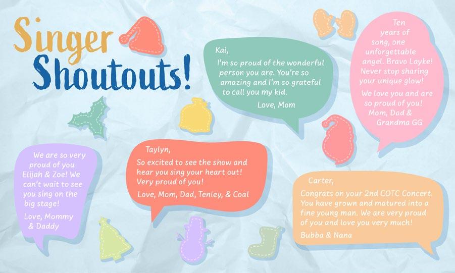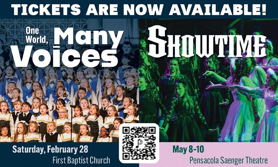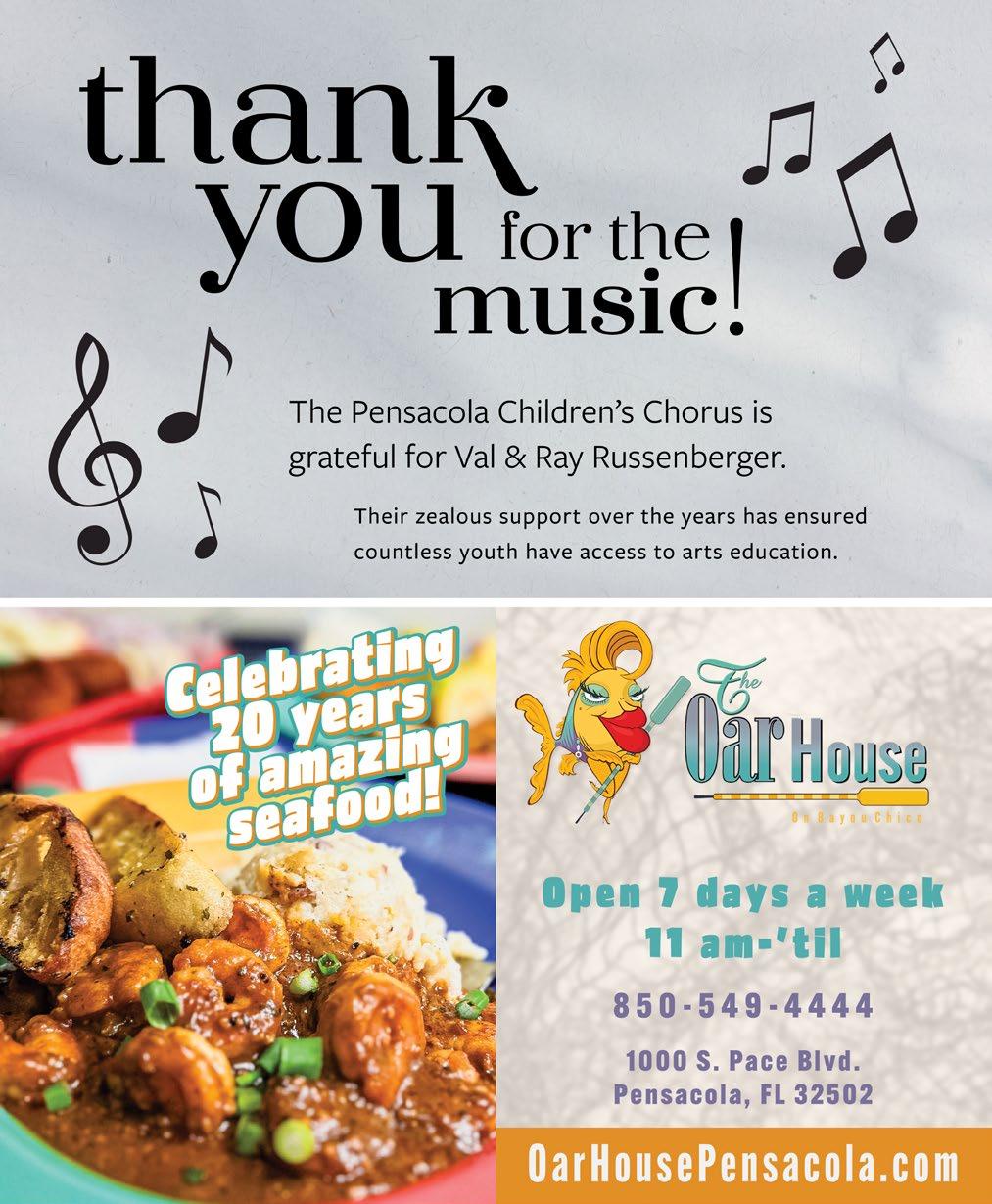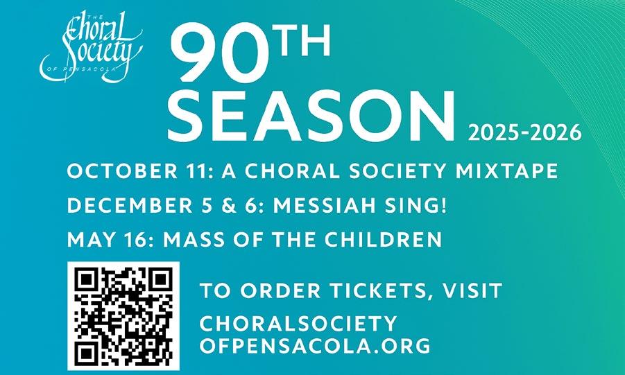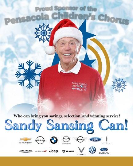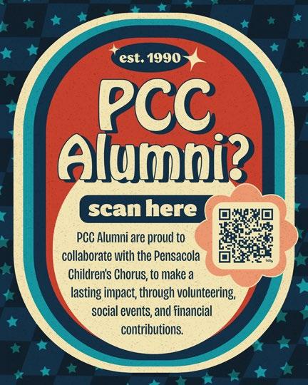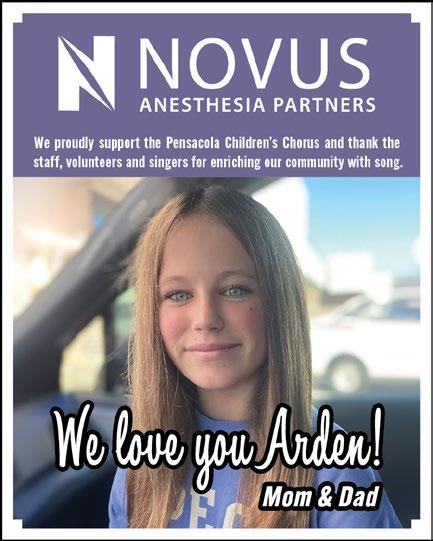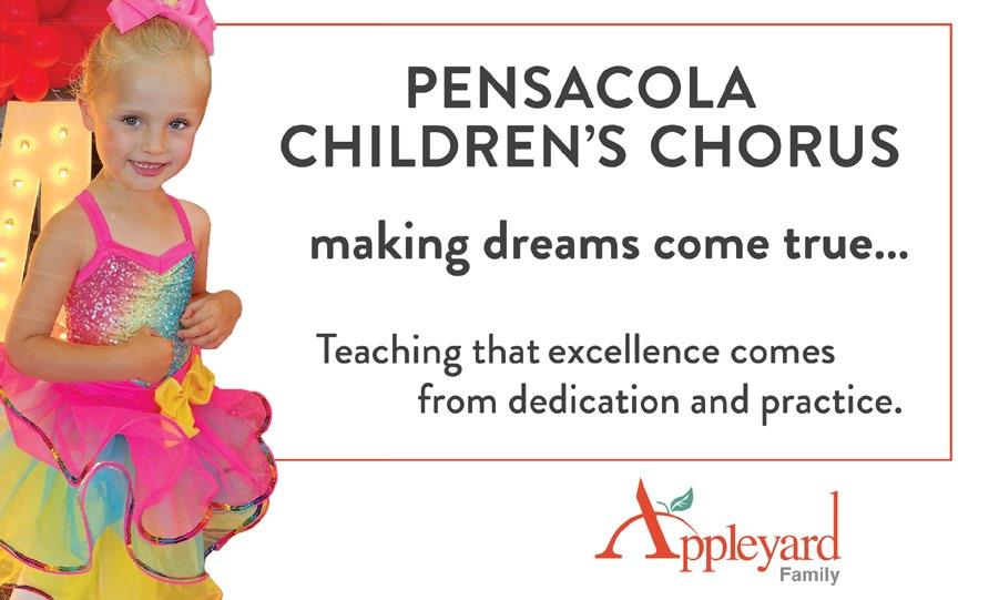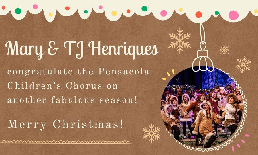DECEMBER IS UPON US, and for yet another year, the Pensacola Children’s Chorus is humming along with the holiday hustle and bustle. By Christmas Day, our 300 members across our 12 choirs will have presented nearly 20 performances for audiences throughout Pensacola and Northwest Florida. I am so appreciative of our families’ dedication and hard work as we spread merriment throughout our community—including with you all here today. Welcome to Christmas on the Coast and to the 36th Season of the Pensacola Children’s Chorus!