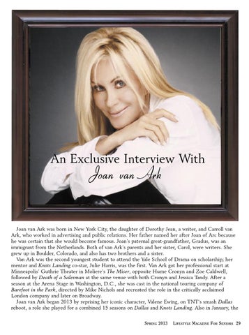 Joan van Ark was born in New York City, the daughter of Dorothy Jean, a writer, and Carroll van Ark, who worked in advertising and public relations. Her father named her after Joan of Arc because he was certain that she would become famous. Joan’s paternal great-grandfather, Gradus, was an immigrant from the Netherlands. Both of van Ark’s parents and her sister, Carol, were writers. She grew up in Boulder, Colorado, and also has two brothers and a sister. Van Ark was the second youngest student to attend the Yale School of Drama on scholarship; her mentor and Knots Landing co-star, Julie Harris, was the first. Van Ark got her professional start at Minneapolis’ Guthrie Theater in Moliere’s The Miser, opposite Hume Cronyn and Zoe Caldwell, followed by Death of a Salesman at the same venue with both Cronyn and Jessica Tandy. After a season at the Arena Stage in Washington, D.C., she was cast in the national touring company of Barefoot in the Park, directed by Mike Nichols and recreated the role in the critically acclaimed London company and later on Broadway. Joan van Ark began 2013 by reprising her iconic character, Valene Ewing, on TNT’s smash Dallas reboot, a role she played for a combined 15 seasons on Dallas and Knots Landing. Also in January, the SPRING 2013