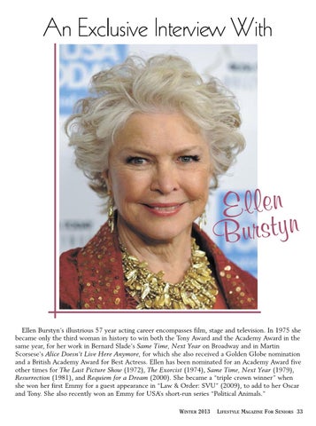 n e l l E n y t s r u B Ellen Burstyn’s illustrious 57 year acting career encompasses film, stage and television. In 1975 she became only the third woman in history to win both the Tony Award and the Academy Award in the same year, for her work in Bernard Slade’s Same Time, Next Year on Broadway and in Martin Scorsese’s Alice Doesn’t Live Here Anymore, for which she also received a Golden Globe nomination and a British Academy Award for Best Actress. Ellen has been nominated for an Academy Award five other times for The Last Picture Show (1972), The Exorcist (1974), Same Time, Next Year (1979), Resurrection (1981), and Requiem for a Dream (2000). She became a “triple crown winner” when she won her first Emmy for a guest appearance in “Law & Order: SVU” (2009), to add to her Oscar and Tony. She also recently won an Emmy for USA’s short-run series “Political Animals.” WINTER 2013