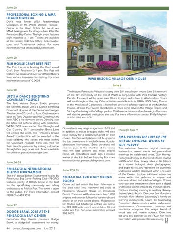 Professional Boxing & MMA Island Fights 34 Don’t miss former WBA Featherweight Champion of the World Derrick “Smoke” Gainer in the Island Fights 34, an all pro MMA boxing event for all ages June 20 at the Pensacola Bay Center. The fight event features eight matches at 7 pm. Tickets are available at the Rodizio Grill Box Office, ticketmaster. com, and Ticketmaster outlets. For more information visit pensacolabaycenter.com. June 20