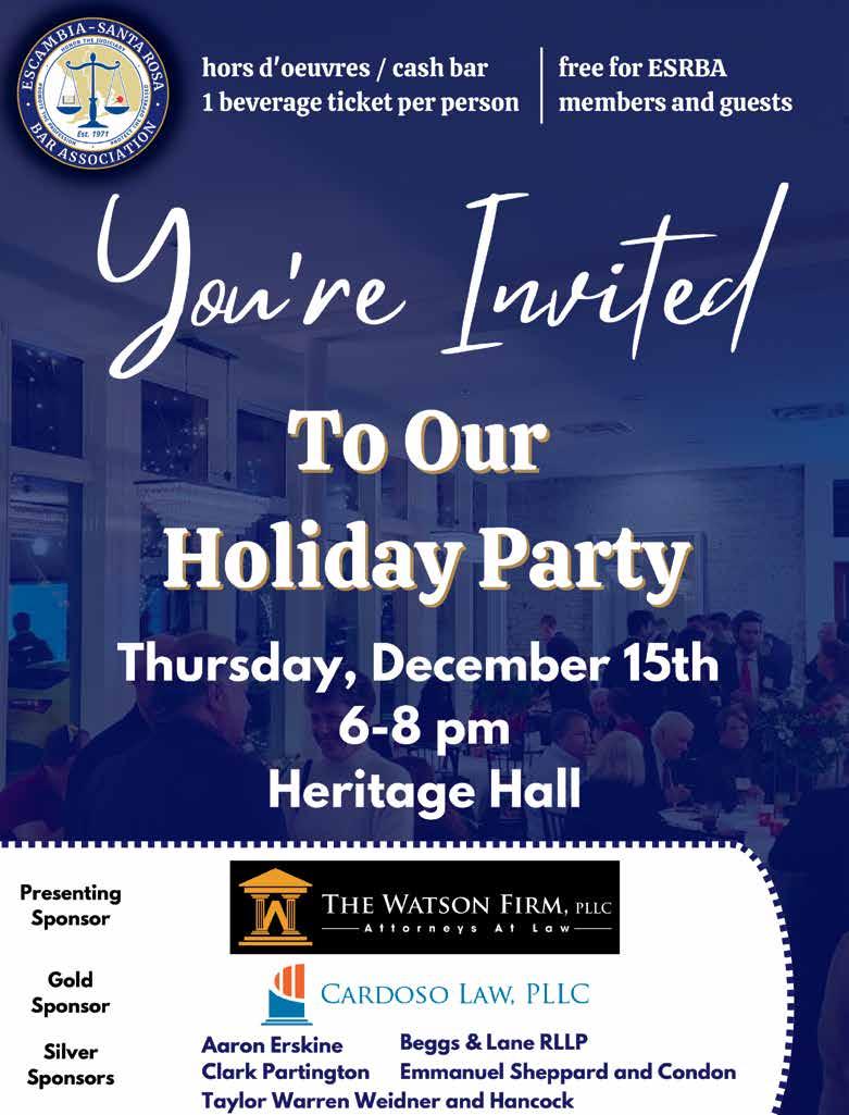 Announcements p. 6 News from the Court p. 10 Young Lawyers Division p. 14 The Bottom Line p. 16 Winter 2022 | VOLUMe 11, i SSU e 4 | eSrBA.COM The Escambia-Santa Rosa Bar Foundation PAST, PRESENT AND FUTURE
