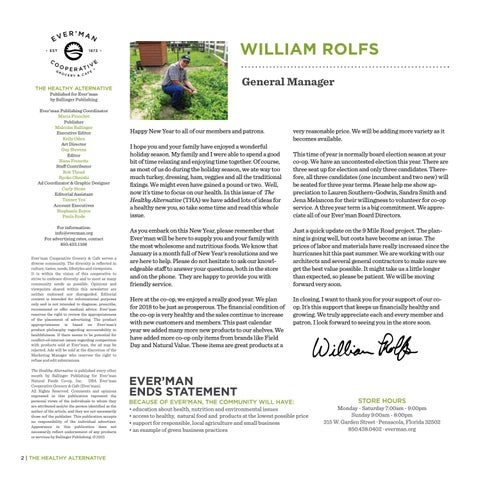 Ever’man Publishing Coordinator Maria Pinochet Publisher Malcolm Ballinger Executive Editor Kelly Oden Art Director Guy Stevens Editor Hana Frenette Staff Contributor Rob Thead Ryoko Ohnishi Ad Coordinator & Graphic Designer Carly Stone Editorial Assistant Tanner Yea Account Executives Stephanie Boyce Paula Rode For information: info@everman.org For advertising rates, contact 850.433.1166 Ever’man Cooperative Grocery & Cafe serves a diverse community. The diversity is reflected in culture, tastes, needs, lifestyles and viewpoints. It is within the vision of this cooperative to strive to embrace diversity and to meet as many community needs as possible. Opinions and viewpoints shared within this newsletter are neither endorsed nor disregarded. Editorial content is intended for informational purposes only and is not intended to diagnose, prescribe, recommend or offer medical advice. Ever’man reserves the right to review the appropriateness of the placement of advertising. The product appropriateness is based on Ever’man’s product philosophy regarding accountability to healthfulness. If there seems to be potential for conflict-of-interest issues regarding competition with products sold at Ever’man, the ad may be rejected. Ads will be sold at the discretion of the Marketing Manager who reserves the right to refuse and edit submissions. The Healthy Alternative is published every other month by Ballinger Publishing for Ever’man Natural Foods Co-op, Inc. DBA Ever’man Cooperative Grocery & Cafe (Ever’man). All Rights Reserved. Comments and opinions expressed in this publication represent the personal views of the individuals to whom they are attributed and/or the person identified as the author of the article, and they are not necessarily those aof the publisher. This publication accepts no responsibility of the individual advertiser. Appearance in this publication does not necessarily reflect endorsement of any products or services by Ballinger Publishing. © 2015