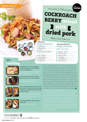 คําวา“สา” ทางเหนือตรงกับคําวา“ยํา” ทางภาคกลาง คือการนําสวนผสม ของผักกับเนือ้ สัตวและน้ําพร�ก เชนปลา หมู วัว มาคลุกเคลากัน เชน สาผัก กาดนอย สามะเข�อ สาจ�น๊ แตคาํ วายํา ทางเหนือจะมีน้ําแกงคลายตมยําทาง ภาคกลาง แตทางเหนือจะไมทานรอนและไมเปร�ย้ ว ยําทางเหนือจะทานแบบ อุน ๆ เชน ยํากบ ยําไก ยําจ�น๊ แหง จะเอาเนือ้ สัตวไปตมพักใหน้ําเย็นกอนแลว นํามาผสมกับน้ําพร�กโรยหนาดวยผักแพว (ผักไผ) ดังนัน� จะสัง� อาหารเหนือ ตองเขาใจคําศัพทกอ นจะไดไมสง�ั แบบเขาใจผิดนะครับ โฮมสุขภัณฑไกดฉบับนี้ เราจะมาทํา “สามะเข�อใสจน๊� หมูแหง” เปนเมนูทผ่ี มชอบมากตอนเปนเด็กๆ แม ทําใหทานมะเข�อตองใชมะเข�อแจเทานัน� สวนหมูแหงแมจะเอาหมูสดไปยางไฟ แลวเก็บไวกอ น 1 คืน พรุง นีเ้ ชาถึงจะทําใหทานโดยผมจะรับหนาทีซ่ อยมะเข�อแจ แมกจ็ ะเอาหมูทย่ี า งไฟ 1 คืน ไปตมจนเปอ ยพอดี แลวยกลงตักหมูมาหัน� บางๆ แลวนํามาคลุกกับน้ําพร�กและเคร�อ่ งตางๆ พระเอกทีข่ าดไมไดมะเข�อแจ คลุก เคลาใหเขากัน ทานกับแคบหมูและขาวนึง่ (ขาวเหนียว) รอนๆ อาหารตางชาติ เหรอ..มันฟ�นไมเทากับอาหารเหนือของเราจร�งๆ (ซ�ง่ เด็กรุน ใหมไมรนู ะ) The salad menu is the mixing of veggies, chili and meat such as fish, pork and beef which are mixed lettuce, mixed eggplant, mixed meat. The salad menu in northern usually comes with soup just like in the central of Thailand. However, the salad menu in northern is usually cooked well such as spicy frog salad, spicy chicken salad, dried beef salad. Meat is usually boiled and mixed with Vietnamese coriander. Home Sukkapan Guide introduces you to cook cockroach berry mixed with dried pork which is my favorite dish when I was a kid. My mother would mix dried pork with cockroach berry. The pork will be boiled and kept for 1 night. Then, mix it with chili paste and spices. Serve well with crispy skin pork and sticky rice.