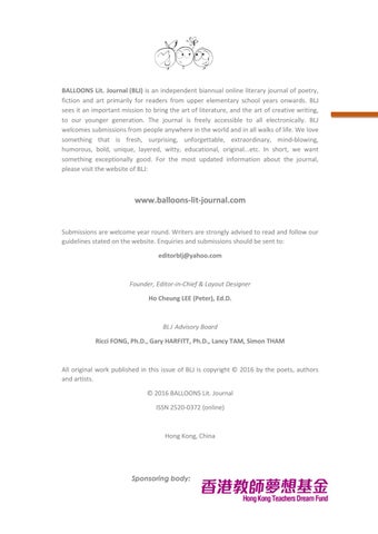 All original work published in this issue of BLJ is copyright Š 2016 by the poets, authors and artists. Š 2016 BALLOONS Lit. Journal ISSN 2520-0372 (online)