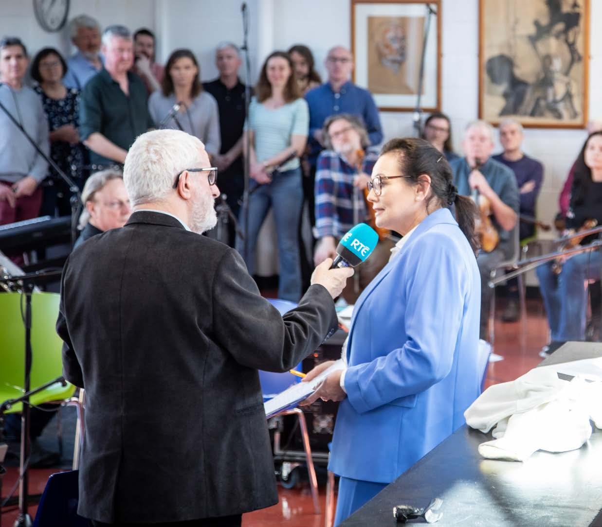 Kieran Hanrahan (RTÉ) speaking with Cecilia Munro (Principal) at the Céilí House recording that celebrated 30 years of the Ceoltóír course with college staff, students and past students.