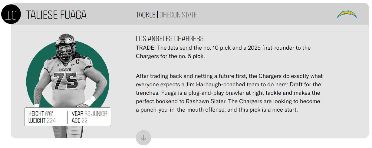 While Barton played left tackle the past three seasons, he projects as an interior lineman he started his college career at center at the NFL level. He's terrific in the running game, blowing just two run blocks in 2023. And by the way, he allowed just one sack and four pressures in 2023.