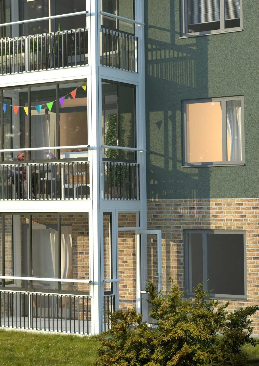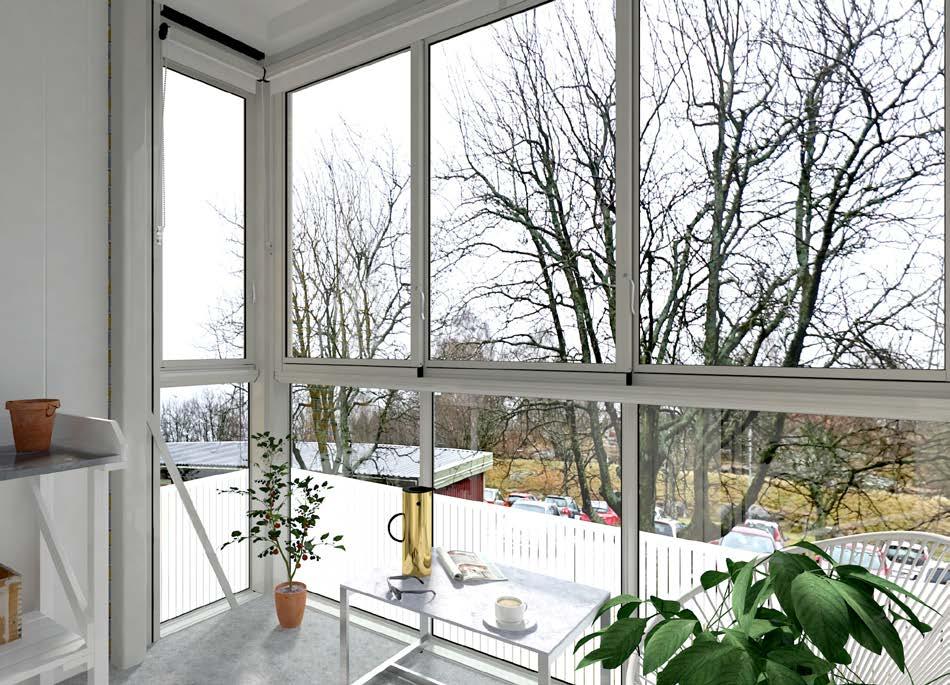 De innglassede balkongene fungerer som et klimabeskyttende skall for eiendommen. Med en klimavegg dekkes hele husets fasade med våre innglassede balkongsystemer. Effekten tilsvarer cirka 10–15 cm ny isolasjon. Innglassingene bidrar også til å varme opp luften før den kommer inn i