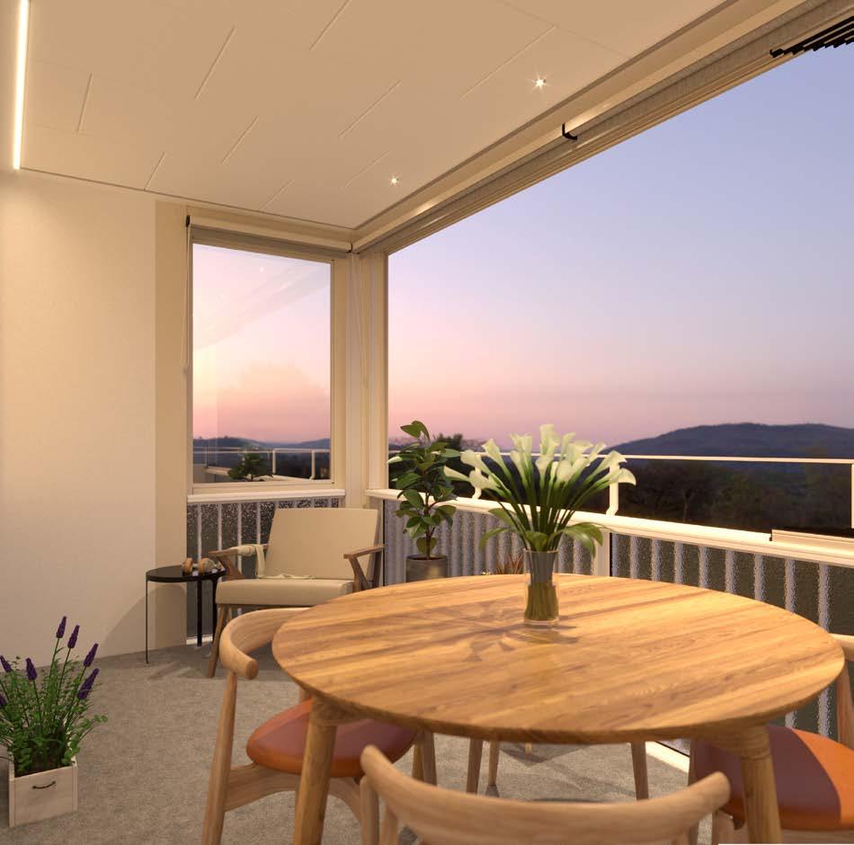 Alle våre innglassede balkonger kan utstyres med LEDslynger som plasseres i den øvre delen på alle fronter. Belysningen kan dimmes og gir et koselig og dekorativt lys.