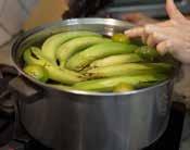 Ponga una olla con agua a hervir, con tapa, cuando ya este caliente incorpore los bananos con todo y cáscara, adicione sal, un paquito de aceite, un chile panameño, las cáscaras de 2 limones, deje que se cocinen por unos 25 minutos. Posteriormente, sáquelos de la olla, deje enfriar un poco y desprenda las cáscaras con la mano, ya un poco fríos, partalos a la mitad, y píquelos a su gusto.
