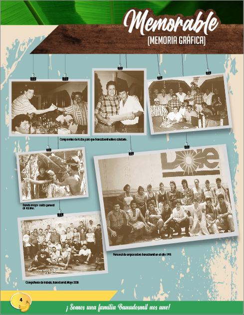 laborales también. No tengo como agradecerle Banadosmil y a tantas personas todo el apoyo que he recibido en cada etapa de mi trayectoria laboral, esto ha hecho la diferencia en mi vida y en la de mi familia. A los socios de Banadosmil quiero agradecerles por el esfuerzo de crear esta compañía y mantenerla estable y productiva a lo largo de los años, prueba de esto es que se han presentado crisis leves y se han superado y ha sido gracias a ese invaluable apoyo, visión de negocio y porque apostaron por un sueño que se mantiene firme, vivo y vibrante. Gracias por invertir y cambiar una comunidad, generar fuentes de trabajo y contribuir a que nosotros también alcancemos esos sueños. No quisiera desaprovechar la oportunidad de agradecer también a la Junta Directiva por las oportunidades que nos brindan a quienes nos desempeñamos en la compañía, por su trabajo en equipo y liderazgo, que nos permite seguir siendo reconocidos como grandes productores, competitivos y conquistando más retos. Finalmente, a Javier Jiménez le agradezco la confianza, el empeño para ejercer la presión necesaria, que hace que las cosas pasen y que uno se comprometa más y se rete siempre, no hay campo para área de confort, sino para trabajar, aportar, aprender y soñar con más Banadosmil para el futuro y cada uno portando su granito de arena para que brille aún con más luz y cimientos sólidos.