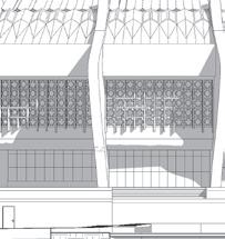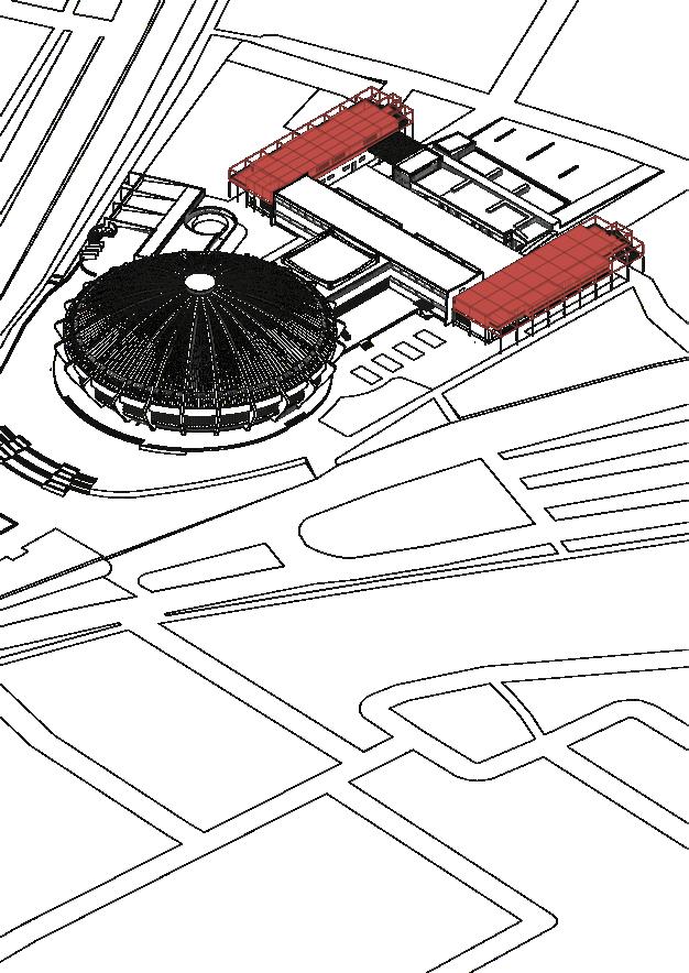 È un edificio ex-novo ipogeo-quota del livello interrato del padiglioneche trova luogo a sostituzione del blocco a chiusura gli edifici a corte. La nuova struttura nasce sull’impronta di quella demolita e si allarga per due moduli di campate verso il parco esistente limitrofo. Il suo disegno avviene a volumi che si sviluppano a diverse altezze, così da creare giochi di luce interni e un’aerazione naturale adeguata.