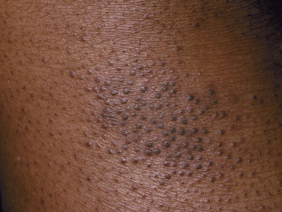 Often called Chicken skin, Alligator skin or Strawberry skin Keratosis Pilaris, or KP for short, is a common skin disorder caused by proteins called keratin clogging hair follicles Though not a chronic or life threatening illness, it can cause large patches of unsightly raised and discolored acne like bumps on the arms, legs, buttocks, and other areas of the body that are difficult to remove and even embarrassing in severe cases