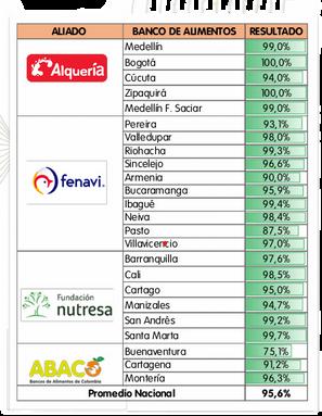 Trabajamos en red con la Asociación de Bancos de Alimentos de Colombia, , empresas aliadas, voluntarios y las instituciones beneficiarias que se convierten en un brazo para extender los beneficios de nuestra gestión de rescate de productos y otros servicios, hacia las comunidades vulnerables que atendemos Es un trabajo mancomunado en la que prevalece la atención a población infantil, mujeres gestantes, madres lactantes, adultos mayores, personas con capacidad reducida y familias en extrema pobreza
