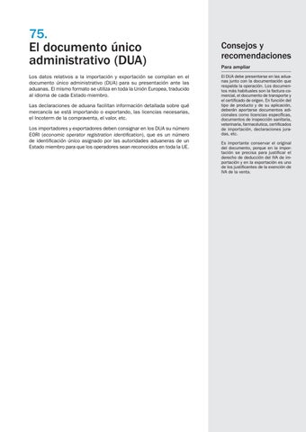 75. El documento único administrativo (DUA) Los datos relativos a la importación y exportación se compilan en el documento único administrativo (DUA) para su presentación ante las aduanas. El mismo formato se utiliza en toda la Unión Europea, traducido al idioma de cada Estado miembro. Las declaraciones de aduana facilitan información detallada sobre qué mercancía se está importando o exportando, las licencias necesarias, el Incoterm de la compraventa, el valor, etc. Los importadores y exportadores deben consignar en los DUA su número EORI (economic operator registration identification), que es un número de identificación único asignado por las autoridades aduaneras de un Estado miembro para que los operadores sean reconocidos en toda la UE.