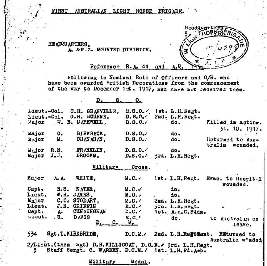 This action at Romani led to a Mentioned in Despatches. On January 1917 he was awarded the Distinguished Service Order for action at Magdhaba. The Unit War Diary recounts a heavy engagement with enemy in a strong entrenched position with the day’s casualties resulting in one killed and eight wounded for the Regiment compared to the Turkish casualties of 97 killed and 1290 prisoners taken captive.