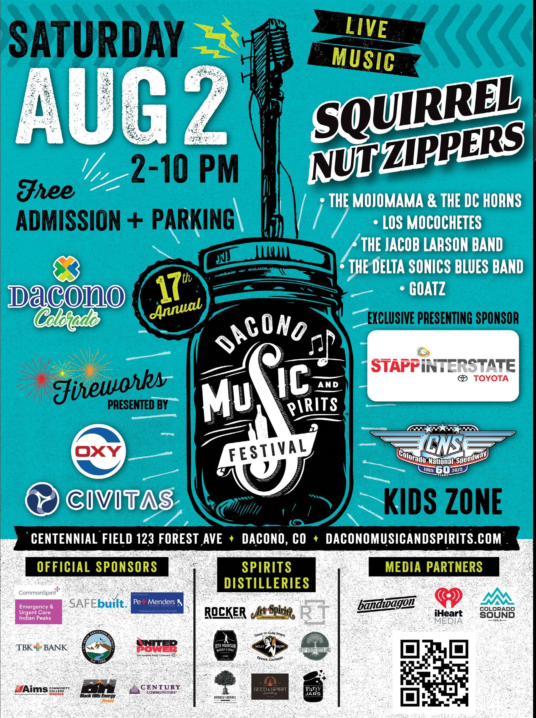 he small-but-mighty town of Dacono, Colorado is turning up the volume for the 17th Annual Dacono Music & Spirits Festival: a celebration of sound, flavor and community that has grown into a can’t-miss summer tradition. This year’s fest will take place on Saturday, August 2 with free admission at Centennial Field in Dacono. The all-day event includes entertainment for all ages, along with an expanded lineup of musical acts, food trucks, distilleries, retail vendors, and more.