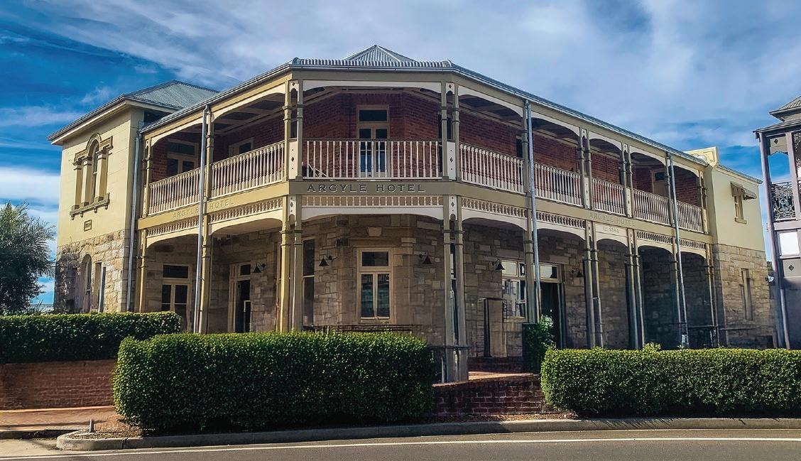 time, alongside sugar, coffee, tobacco and more. A single-storey wooden pub – the first Argyle Hotel – was built in 1867. In 1887, work commenced on a new two-storey, 14-room hotel, made of stone with a concrete foundation, and seemingly no expense spared on the grand Late Victorian details. The Argyle Hotel opened in 1894.