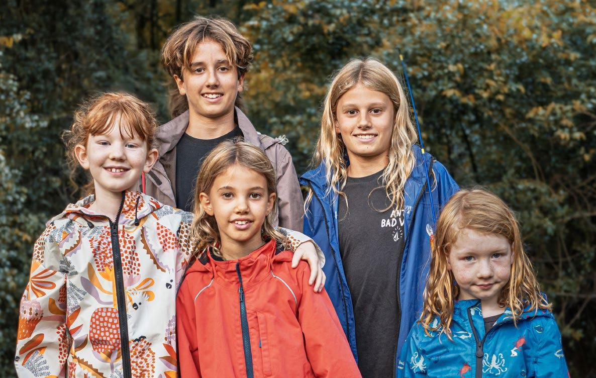 Little anglers (left-front) Lotte Hannah, Nina Bachle, Hamish Hannah, (left-back) Otis Bachle, Theo Bachle
