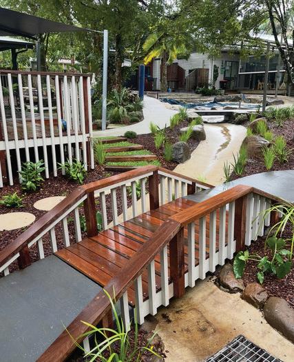 Winding pathways weave through planted gardens, inviting little feet to discover new spaces. Smooth pavers become stepping stones to adventure, while a dry creek bed channels water during rain, creating a stream for children to interact with. The yard was also designed to channel water to the creek to minimise damage from heavy rainfalls. Rainy days are filled with laughter as children explore in their gum boots and raincoats. There’s a timber bridge to cross and even a bike track.