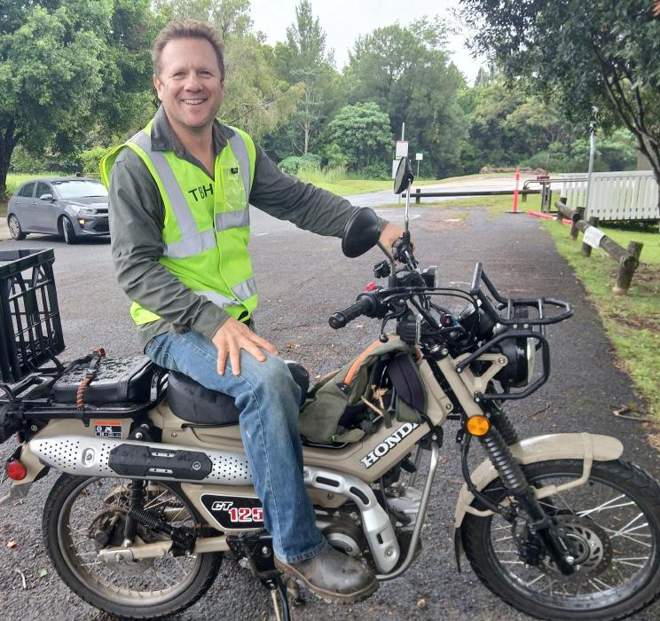 The roles are very different. While the treasurer is a desk job fulfilling my passion for numbers, delivering the Herald each month is an outdoor pursuit. I love riding my Honda CT125 postie bike through the scenic back roads of Bangalow’s hinterland, as I make my way to 360 letterboxes from Coorabell to Binna Burra, Possum Creek, Brooklet and Newrybar. Once the magazine exceeds 32 pages, it gets quite bulky to deliver. The summer edition was a massive 56 pages, meaning I needed to reload many more boxes of magazines.