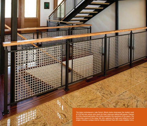 The large contemporary Lake Forest, Illinois home showcases the modern look of S-15 flat wire woven wire mesh for their staircase railing infill panels. Framed in a thin channel perimeter, the railing maintains the openness of the space. The intercrimp weave of the large flat wire captures the light and reflects it at all angles creating a unique interior design element that will create neighbor envy.