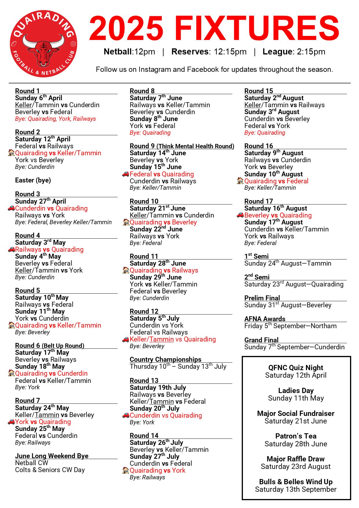 You know it, you love it - Last Bull in the Pen is back for 2025! Buy a number (from 1 - 100) for $100 each. At each home game, 10 numbers will be drawn, with the 10th winning $100 back. At our Wind Up Event (on Saturday 13th September), in the very last draw, the last 3 drawn will win big! Third Last: $1000, Second Last: $1500, Last Bull in the Pen: $3000. To claim your number, contact Jill Hayes via text 0459 220 053, messenger or comment on the Facebook post with your name and address, and make payment to confirm. Payment by Online Bank Transfer preferred. Account Name: Quairading Football Club, BSB: 036172, ACC: 760190. Permit No: LS223003225.