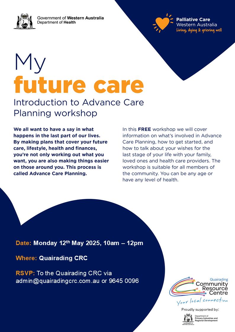 admin@quairadingcrc.com.au or 9645 0096. In this FREE workshop, delivered by Palliative Care WA, we will cover information on what’s involved in Advance Care Planning, how to get started, and how to talk about your wishes for the last stage of your life with your family, loved ones and health care providers. The workshop is suitable for all members of the community. You can be any age of have any level of health.