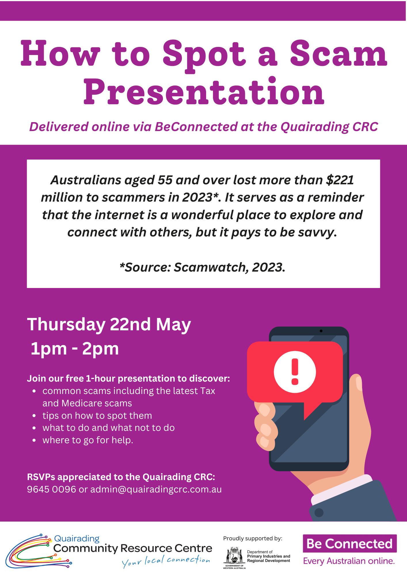 Thursday 22nd May from 1pm to 2pm, delivered online via BeConnected at the Quairading CRC. Join our free 1-hour presentation to discover: common scams including the latest Tax and Medicare scams, tips on how to spot them, what to do and what not to do, where to go for help. RSVPs appreciated to the Quairading CRC, 9645 0096 or admin@quairadingcrc.com.au