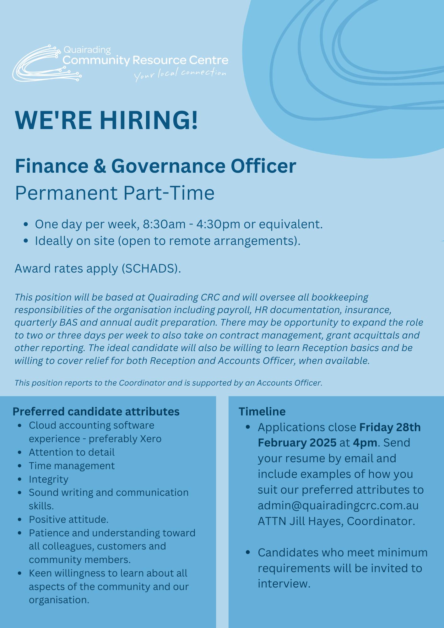 We’re hiring! Join our team in a one day per week role. This position will be based at Quairading CRC and will oversee all bookkeeping responsibilities of the organisation including payroll, HR documentation, insurance, quarterly BAS and annual audit preparation. There may be opportunity to expand the role to two or three days per week to also take on contract management, grant acquittals and other reporting. The ideal candidate will also be willing to learn Reception basics and be willing to cover relief for both Reception and Accounts Officer, when available. For more details or to apply, please email admin@quairadingcrc.com.au ATTN Jill Hayes, call 9645 0096 or pop in for a chat.