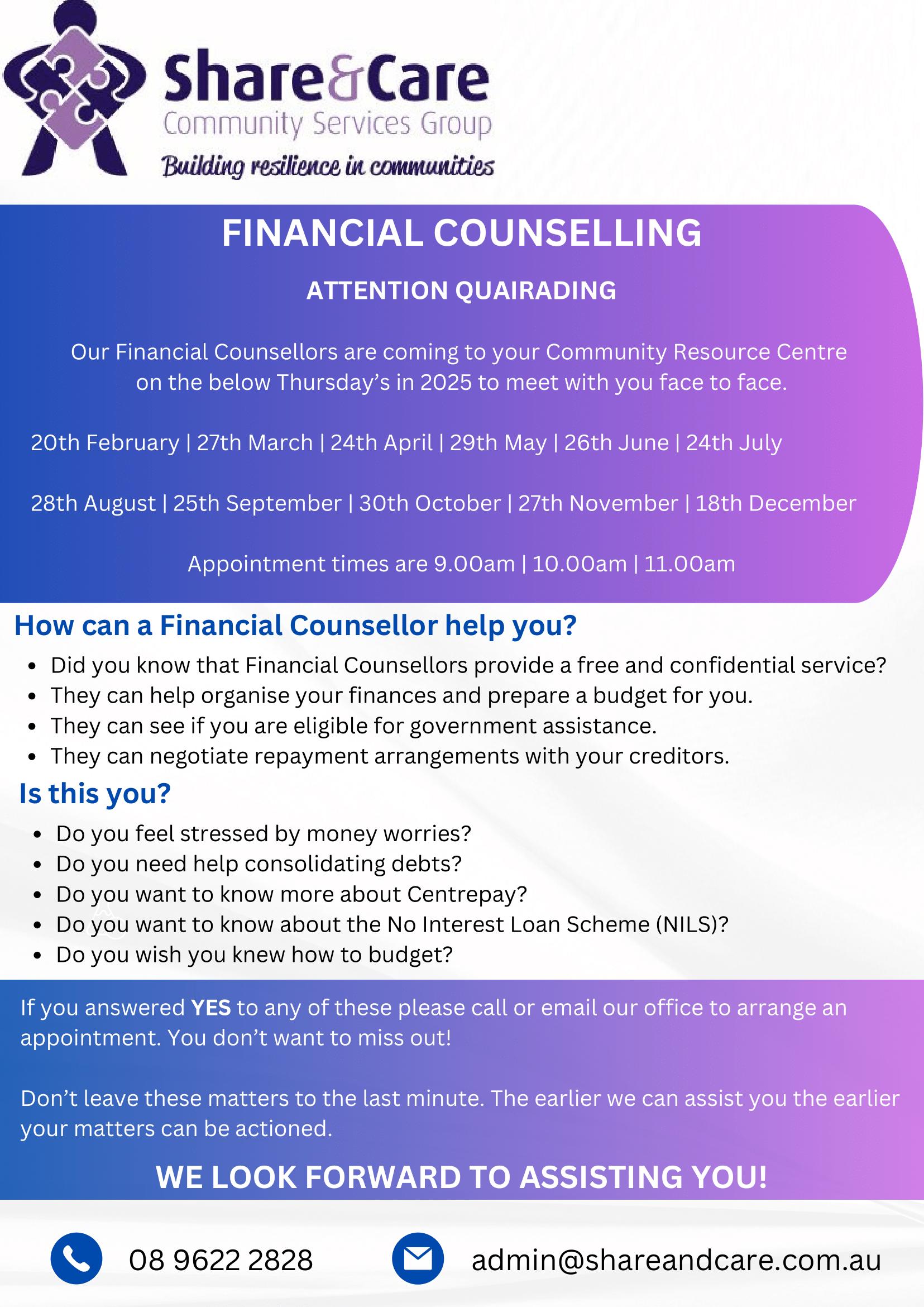 Thursday 27th March. Our Financial Counsellors are coming to the Quairading CRC once a month through 2025 to meet with you face to face. Appointment times are 9am, 10am and 11 am Call 9622 2828 to book.