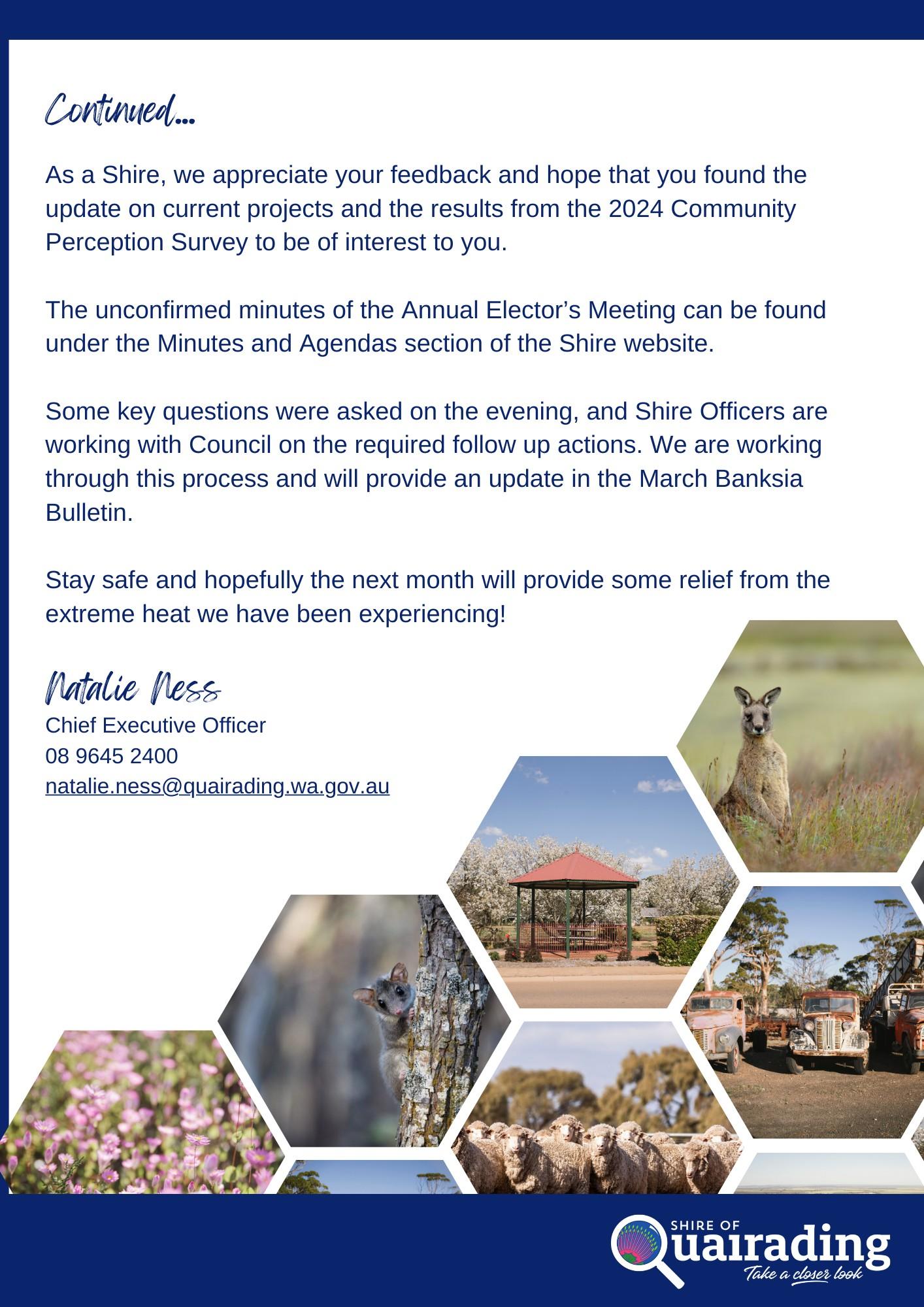 For all enquiries: Banksia Bulletin 1 Parker Street, Quairading WA 6383 (08) 9645 0096 admin@quairadingcrc.com.au