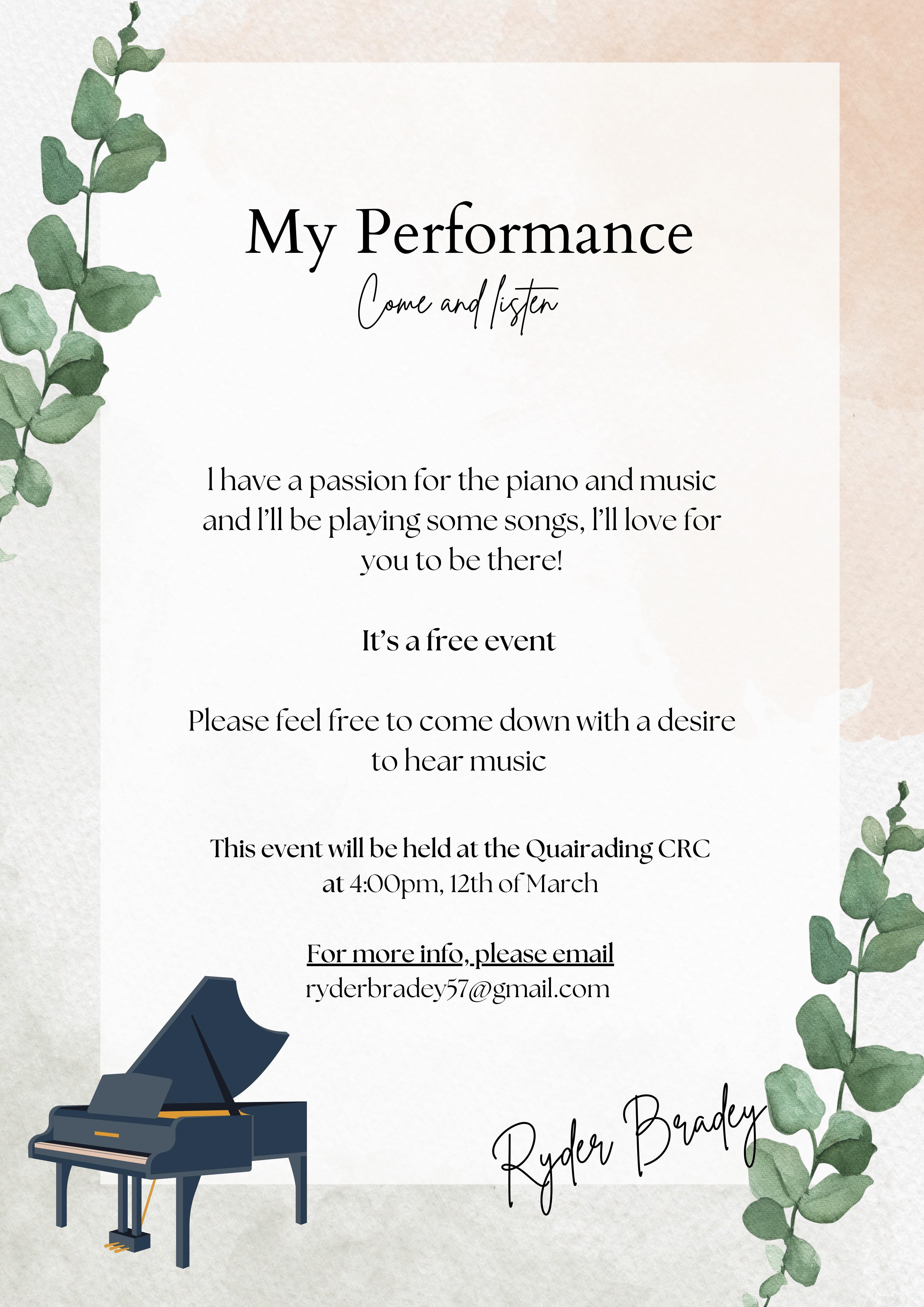 Wednesday 12th March, 4pm at the Quairading CRC. I have a passion for piano and music and l'll be playing some worship and other songs. I'd love for you to be there. It's a free event. Please feel free to come down and listen with a desire to hear music. Ryder Bradey.