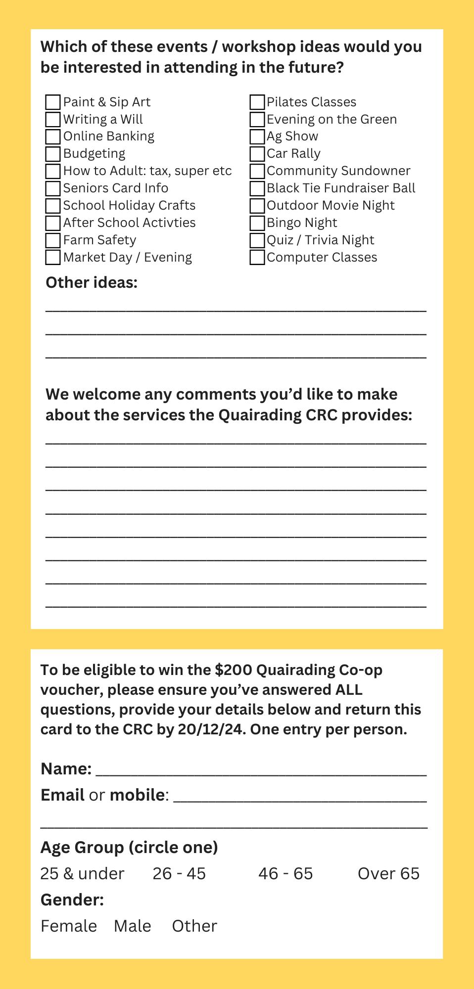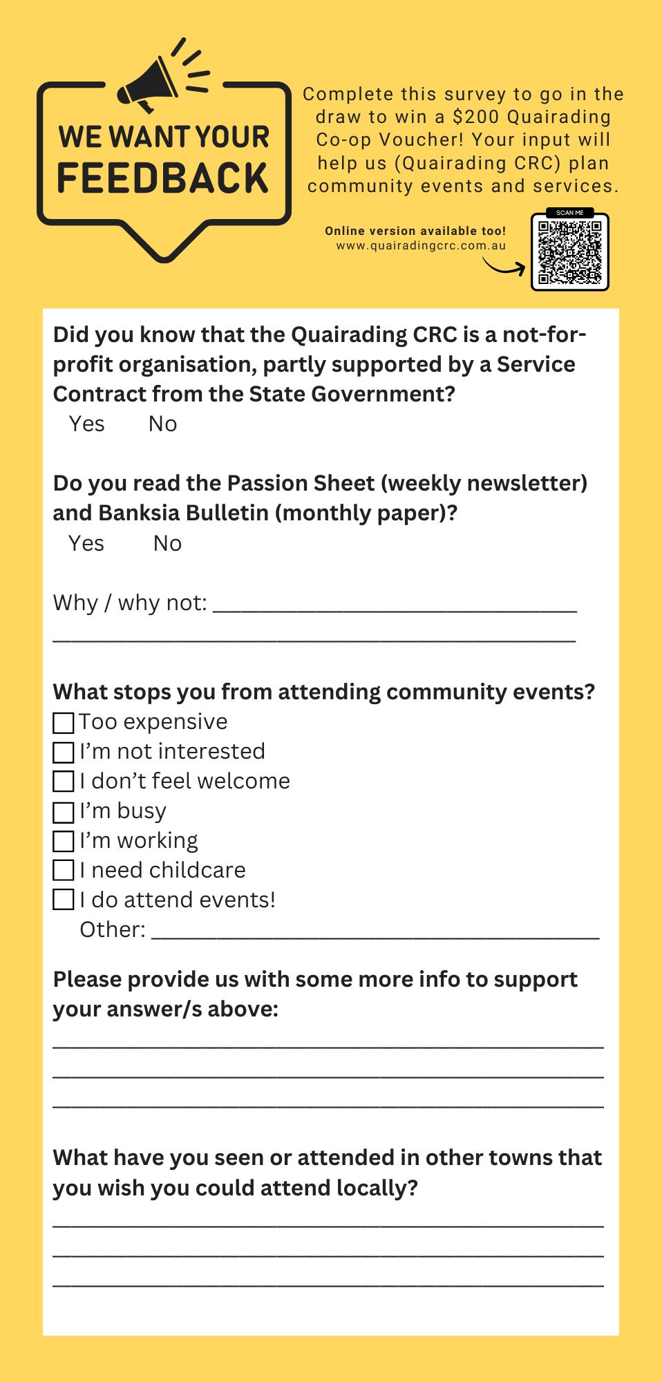We’ve put out a brief community survey to just check in on your wants and needs in terms of what the Quairading CRC might be able to deliver next year. We generally think we’re pretty well engaged, but getting some feedback documented is always really great to double check, and to use in funding applications to prove community need. There’s a copy of the survey in this edition of the Banksia Bulletin, coming to you in a mail drop (unless you’re anti-junk mail) and on the home page of our website www.quairadingcrc.com.au we’d love for you to help us out by filling one out. Complete surveys will go in the draw to WIN a $200 Quairading Co-op voucher, drawn 21st December (gravy day!) which I dare say would be of use to everyone.