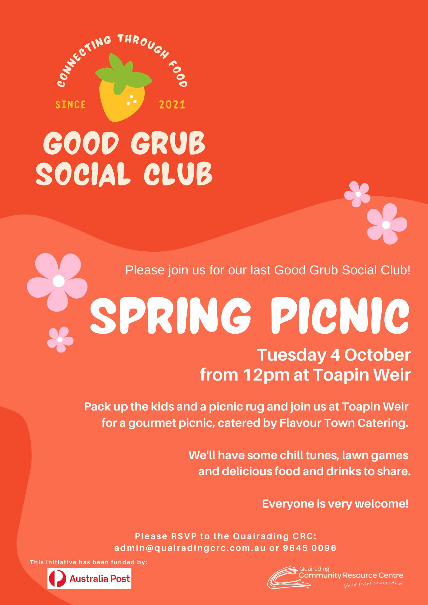 The Spring Picnic is the last event in our Good Grub Social Club free lunch series and we encourage absolutely anyone who’s interested in getting out of the house, sharing a meal and chatting with others to come along. Beautiful picnic lunch packs will be catered by Flavour Town Catering and we’ll provide delish mocktails, some picnic rugs, good tunes and a lawn game or two - so you can just BYO camp chair and sunscreen! Oh and good shoes if you fancy a scramble to the top of the rock! Conveniently (strategically!) it’s school holidays too, so kids of all ages are of course welcome too! Please RSVP to the Quairading CRC by email, call, visit or message via Facebook or Instagram so we can make sure there’s enough food!