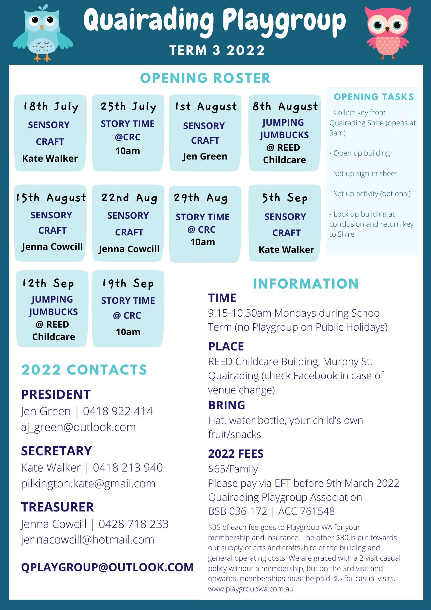 0429 451 093 Second Tuesday of each month, 7:30pm @ Q CRC & Q Hotel (Alternating) PLAYGROUP Monday 9:00am 10:30am @ Daycare Centre on Murphy Street QARRAS