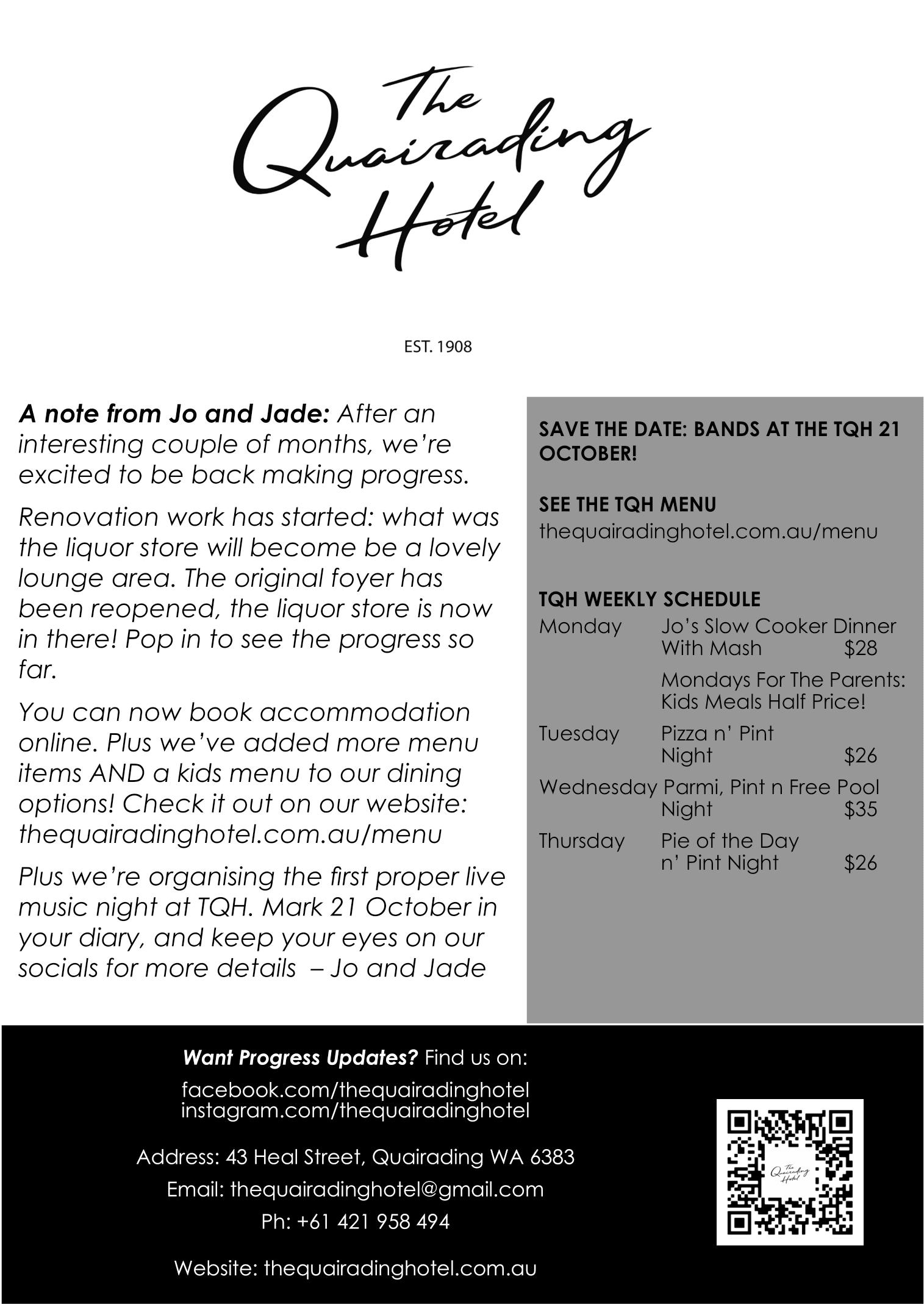 Quairading CRC ‘Business’ members will received a 20% discount. Advertisers willing to pay 10 months of advertising up front will receive a further 10% discount. Community content and local events are published free of charge for Quairading CRC ‘Club’ members.