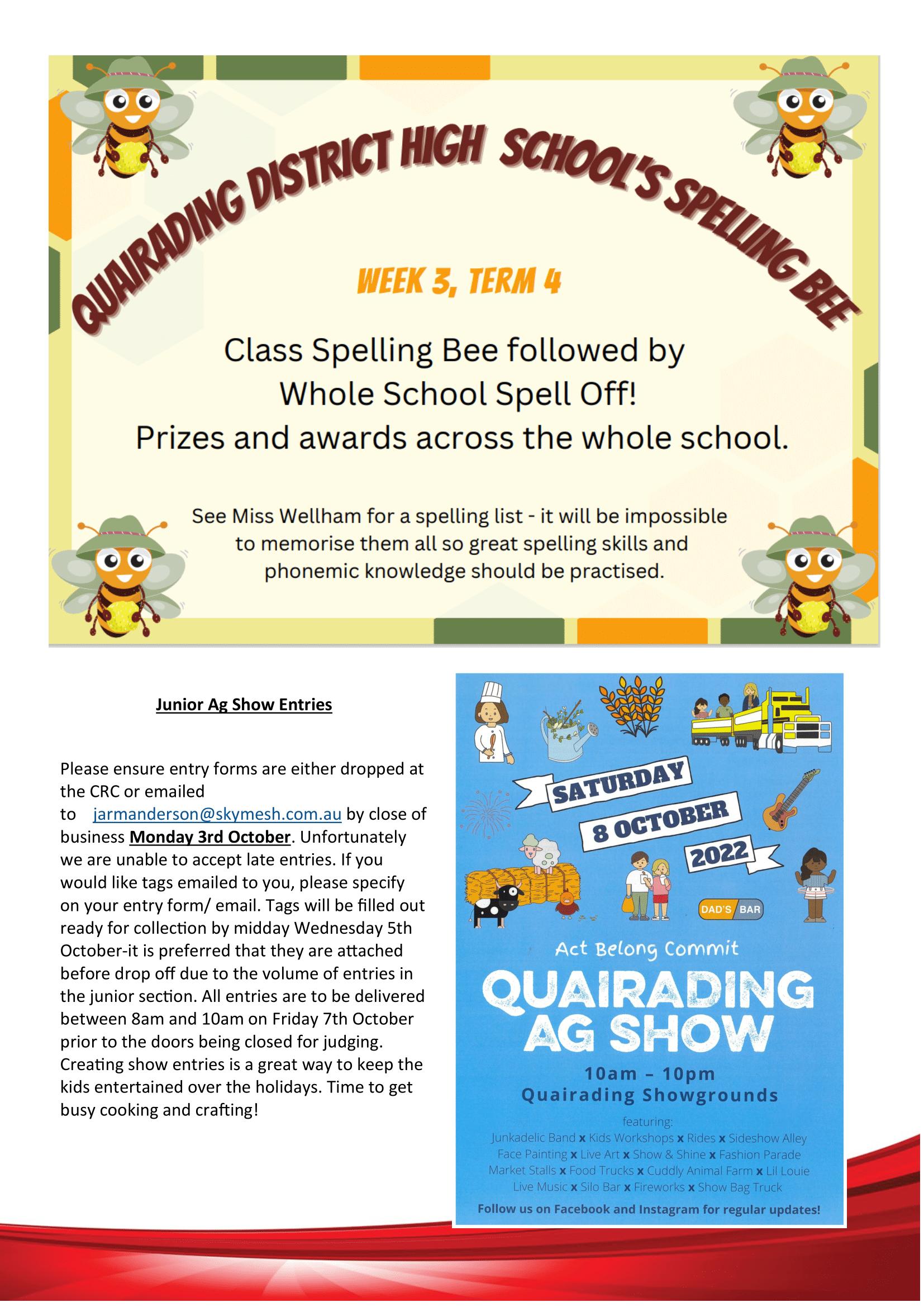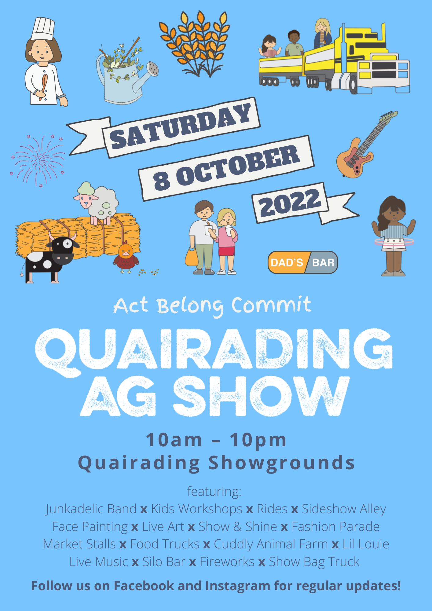 8 October 2022, 10am 10pm We’re very excited about ALL the things we’re planning to have on offer on show day! There really will be something for everyone with plenty of opportunity to be entertained, be informed, be amazed, or just kick back and relax. Feel free to email us at quairadingagshow@outlook.com with any enquiries.