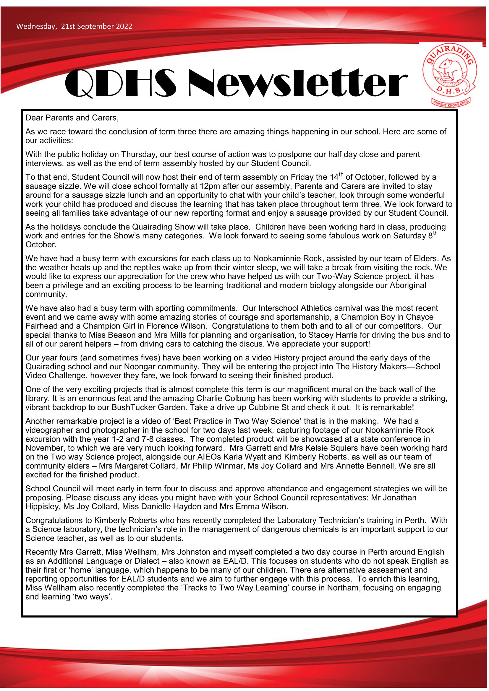 Two local events we hope we can maintain perfect spring weather for next week are our Spring Picnic @ Toapin Weir on Tuesday 4th and of course the Ag Society’s, Quairading Ag Show on Saturday 8th!