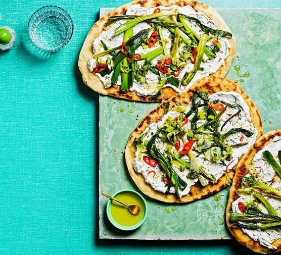 Make vibrant spring onions the star of the show, scattered over creamy, tangy feta and soft flatbreads for a simple yet stunning lunch