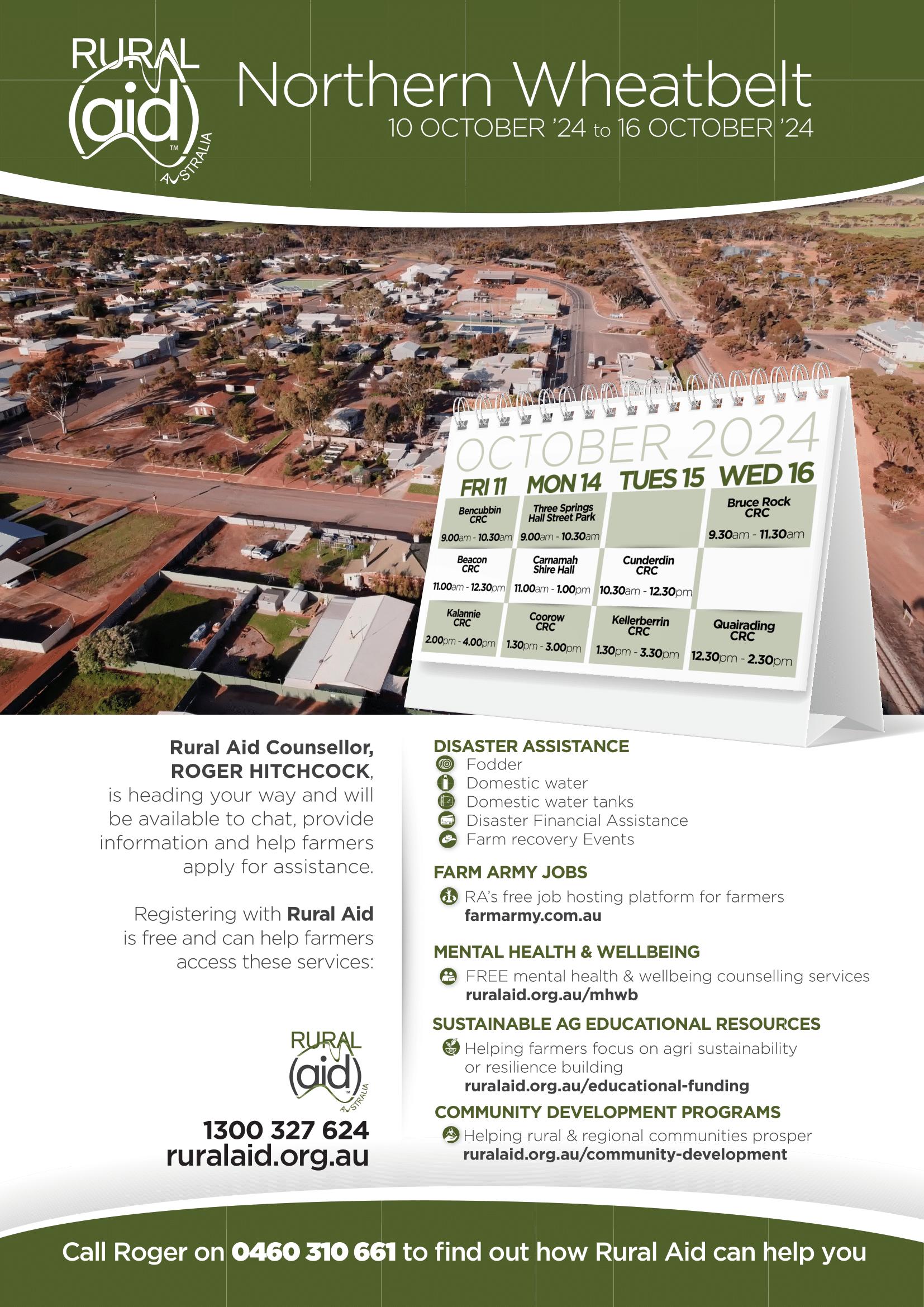 Counsellor & Community Representative West Australia based in Narrogin Rural Aid Australia M: 0460 310 661 |P: 07 3153 4656 |E: roger.hitchcock@ruralaid.org.au Head Office : 1300 327 624 / Mental Health and Counselling Line 1300 175 594