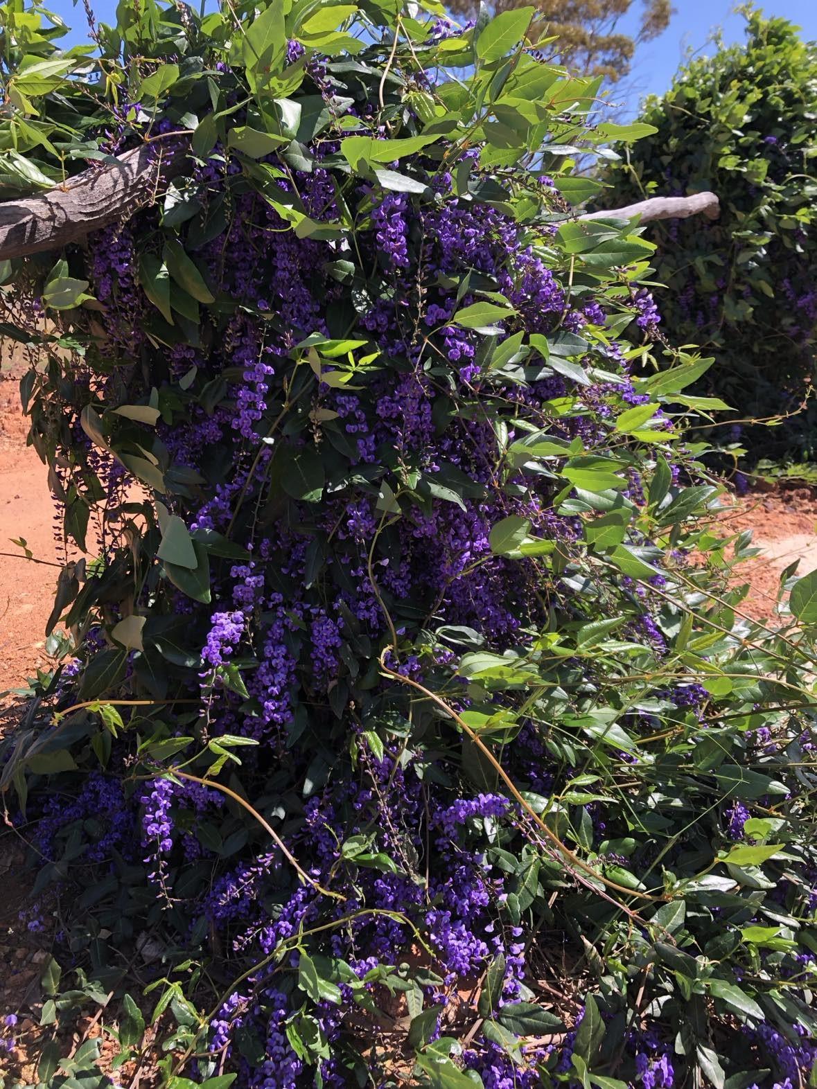 Plant of the month – This month the chosen plant is Hardenbergia. Hardenbergia is a genus of three species of flowering plants in the pea family, Fabaceae and is endemic to Australia. It is a very forgiving plant and although the literature about it says it needs moist well drained soils, it certainly does have that at Eaglewood Farm because the soil in summer is certainly not moist and as there isn’t abundant water it does not get any water other than what falls from the sky. By the end of the dry season, it’s looking decidedly worse for wear but as soon as it receives the first rain up it springs again. It is a climber but as long as it doesn’t find something to climb it will happily scramble along as a ground cover. However, if it finds something to climb it can reach up to three metres in height. Hardenbergia comes in two main colours purple, often called H. violacea or Happy Wanderer, a white form, H. alba or White Out and a pink/purple one, H. violacea rosea, Pink Coral Pea. There is also a shrubby version which only grows to about one metre tall. It grows well from tube stock planted in late autumn and takes about three years to really make a good display. If it were to receive water during summer it would undoubtedly grow much quicker and carry more flowers, so it is definitely a worthy garden plant.