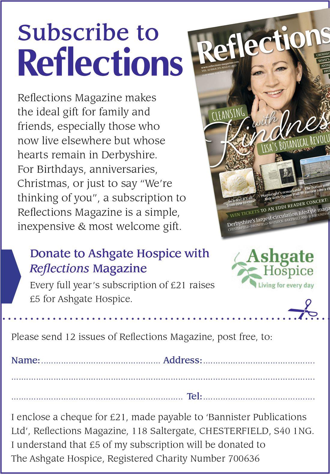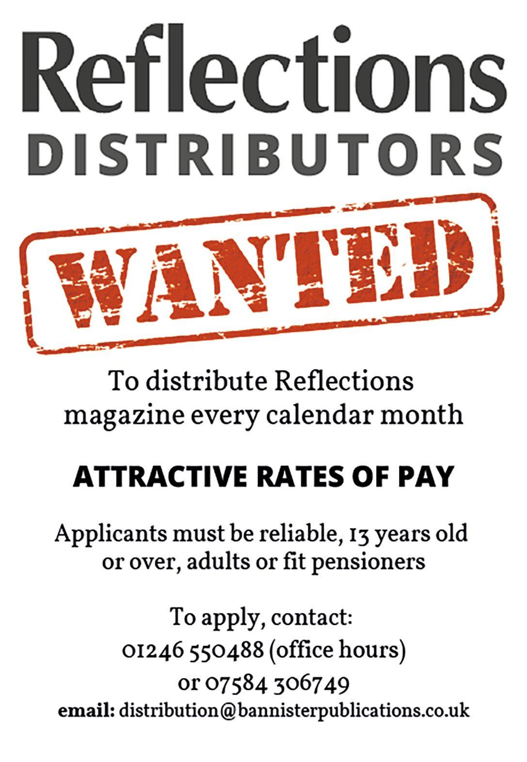 Publishedby:BannisterPublicationsLtd. Tel.01246550488(3lines).BannisterPublicationsLimited, Office2AMarketHall,MarketPl,Chesterfield,Derbyshire.S40 1AR. Reflectionsispublishedmonthlyanddelivereddirectlyto homeswhichfallintotaxbandsDtoHandthefollowingpostcode areas:DE4-2,3,4,5/DE451/S185/S301/S40-1,2,3,4/S41 0,S417,8,9/S42-5,6,7/S43-1,2,3/S450,S459.