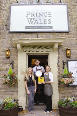 Above: Clare (left) with head chef Matt Booth and her sister, Elena Whalley, with the plate and plaque recognising the 2 star AA Rosette Award for Culinary Excellence achieved by The Prince of Wales