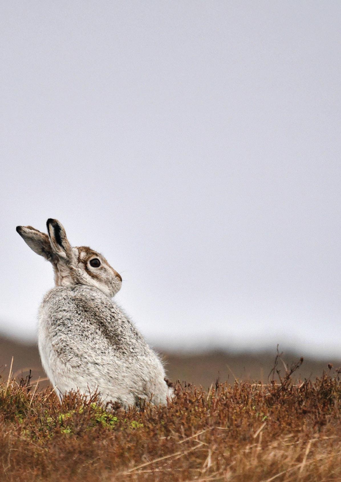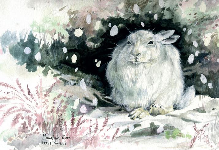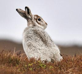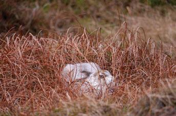 Left: A Peak District mountain hare, in its winter white coat, shelters in a snow storm