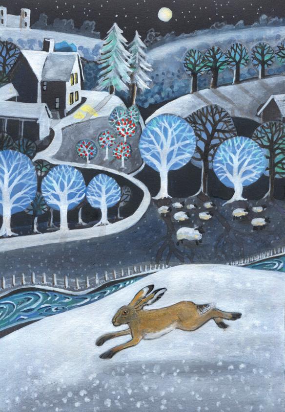 Above: A hare hurtles through a snowy landscape in this folk art inspired painting