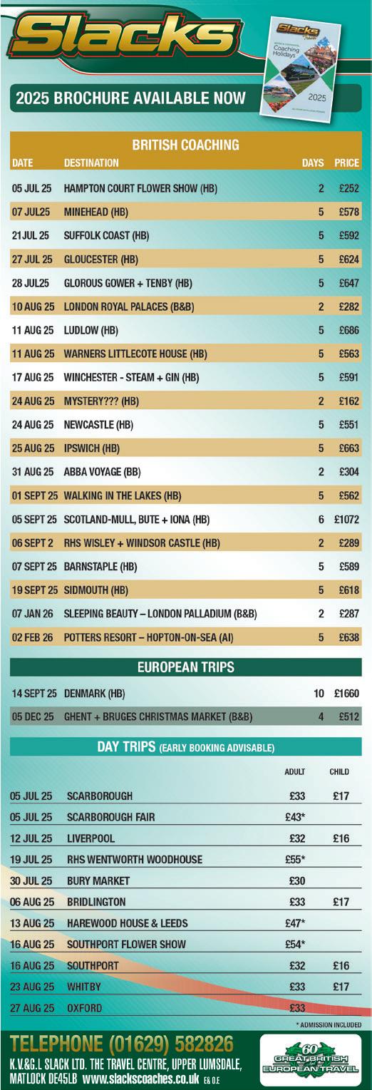 4 Holymoorside Horticultural Society. ‘National Plant Collections’ a talk by Don Witton, 7.45pm. URC meeting room, Cotton Mill Hill, Holymoorside. All welcome. Call 01246 568000