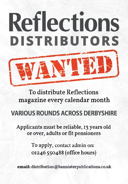 Published by: Bannister Publications Ltd. Tel. 01246 550 488 (3 lines). Bannister Publications Limited, Office 2A Market Hall, Market Pl, Chesterfield, Derbyshire. S40 1AR. Reflections is published monthly and delivered directly to homes which fall into tax bands D to H and the following postcode areas: DE4 - 2, 3, 4, 5 / DE45 1 / S18 5 / S30 1 / S40 - 1, 2, 3, 4 / S41 0, S41 7, 8, 9 / S42 - 5, 6,