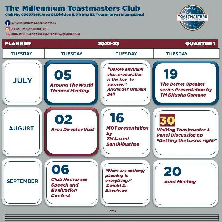 Thank you Millennium Toastmasters Club for giving me this wonderful opportunity to plan the meetings and look forward to arranging meetings for the next 2 quarters!