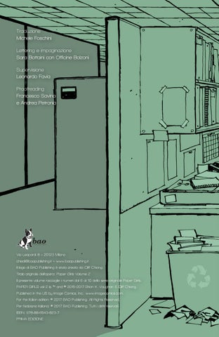 Via Leopardi 8 – 20123 Milano chiedi@baopublishing.it – www.baopublishing.it Il logo di BAO Publishing è stato creato da Cliff Chiang. Titolo originale dell’opera: Paper Girls Volume 2 Il presente volume raccoglie i numeri dal 6 al 10 della serie originale Paper Girls. PAPER GIRLS vol 2 is ™ and © 2015-2017 Brian K. Vaughan & Cliff Chiang. Published in the US by Image Comics, Inc.: www.imagecomics.com. For the Italian edition: © 2017 BAO Publishing. All Rights Reserved. Per l’edizione italiana: © 2017 BAO Publishing. Tutti i diritti riservati. ISBN: 978-88-6543-823-7 PRIMA EDIZIONE