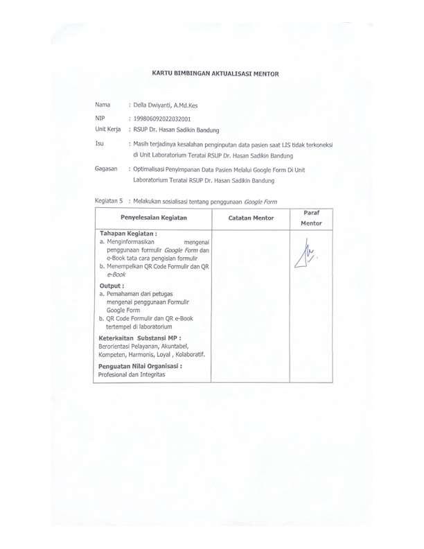 laksanakan untuk memecahan isu di Unit Laboratorium Teratai RSUD dr. Hasan Sadikin Bandung dengan implementasi Nilai Dasar ASN Ber-AKHLAK, Visi, Misi dan Nilai Organisasi.